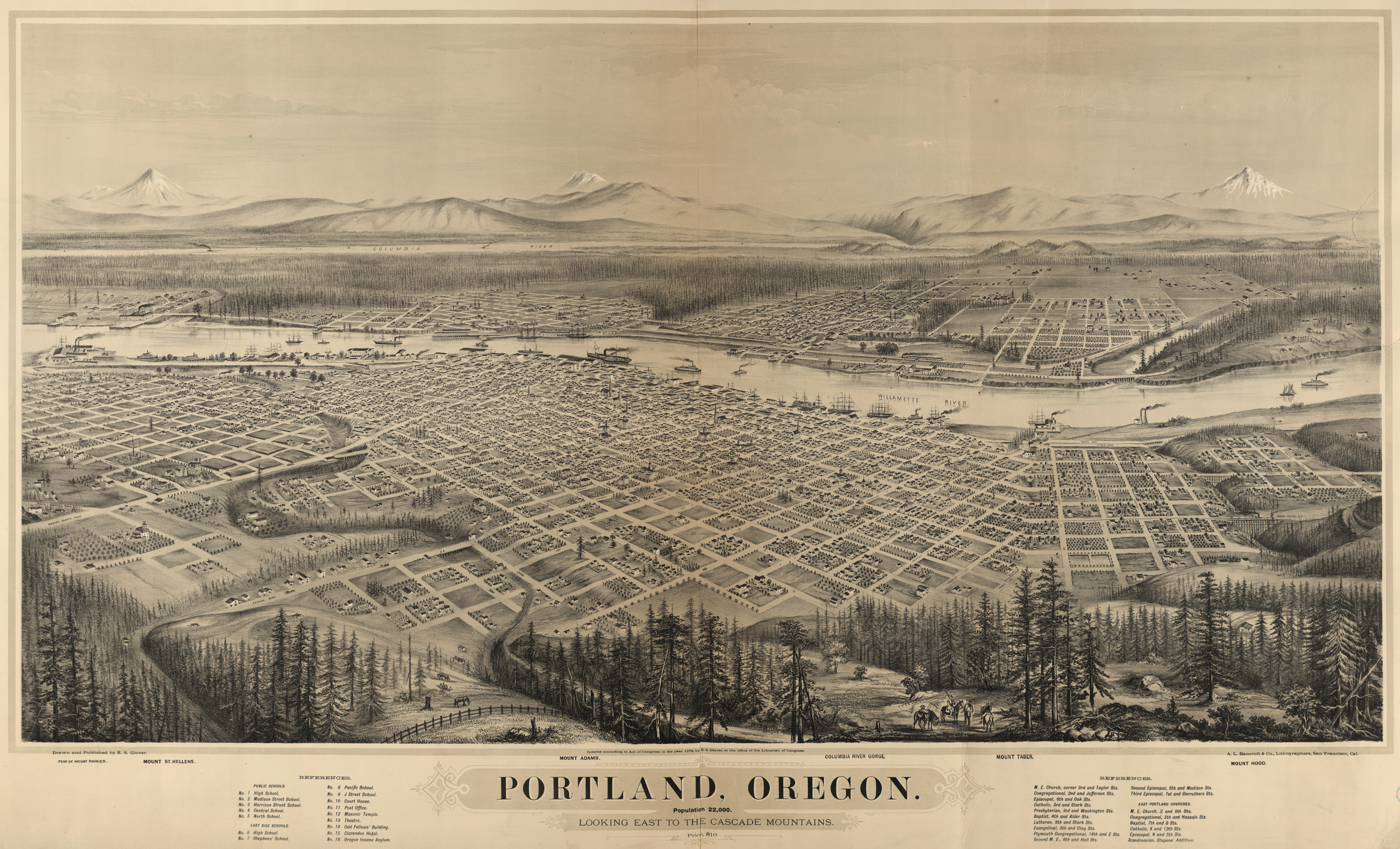 This fold-out poster of Portland, published in 1879, shows the Portland that greeted Jonathan Bourne Jr. when he first set foot in his new hometown, stepping off the gangplank of a ship that had carried him over from the Far East, where he'd been stranded by shipwreck. Portland would never be the same .... (Image: Library of Congress)