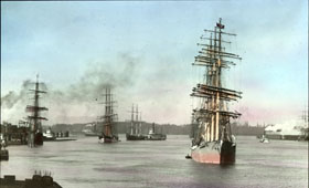 A lovely hand-tinted image of ships in the Portland Harbor during the 1880s or 1890s; some of these ships may actually have been whaling barques.The noticeable absence of oceangoing steamships from this image suggests it's on the older side. (Image: Oregon State University archives)