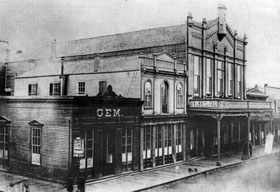 The Gem Saloon and Oro Fino Saloon and Theater, located on First Street between Oak and Stark, in 1876. The Oro Fino was half owned by Portland's city police chief, Edouard Chambreau's old gold-field gambling crony James Lappeus. (Image: Oregon Historical Society)