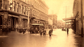 A view of the North End under water during the flood of 1894, as seen at the intersection of First and Stark streets, looking northward. At this time, the Stark Street Ferry was still operating, and the street signs to the right of the frame point toward the ferry landing. (Image: City of Portland Archives)