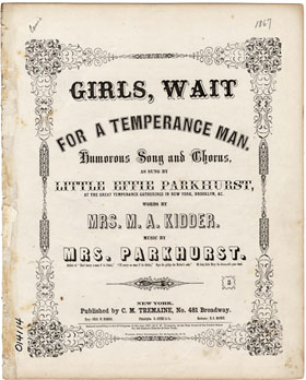 The front cover of a booklet of sheet music for a song written in 1867 to be played and sung at temperance rallies. The temperance crusaders who finally convinced Edouard Chambreau to quit his liquor-and-gambling life would have been very familiar with this song.