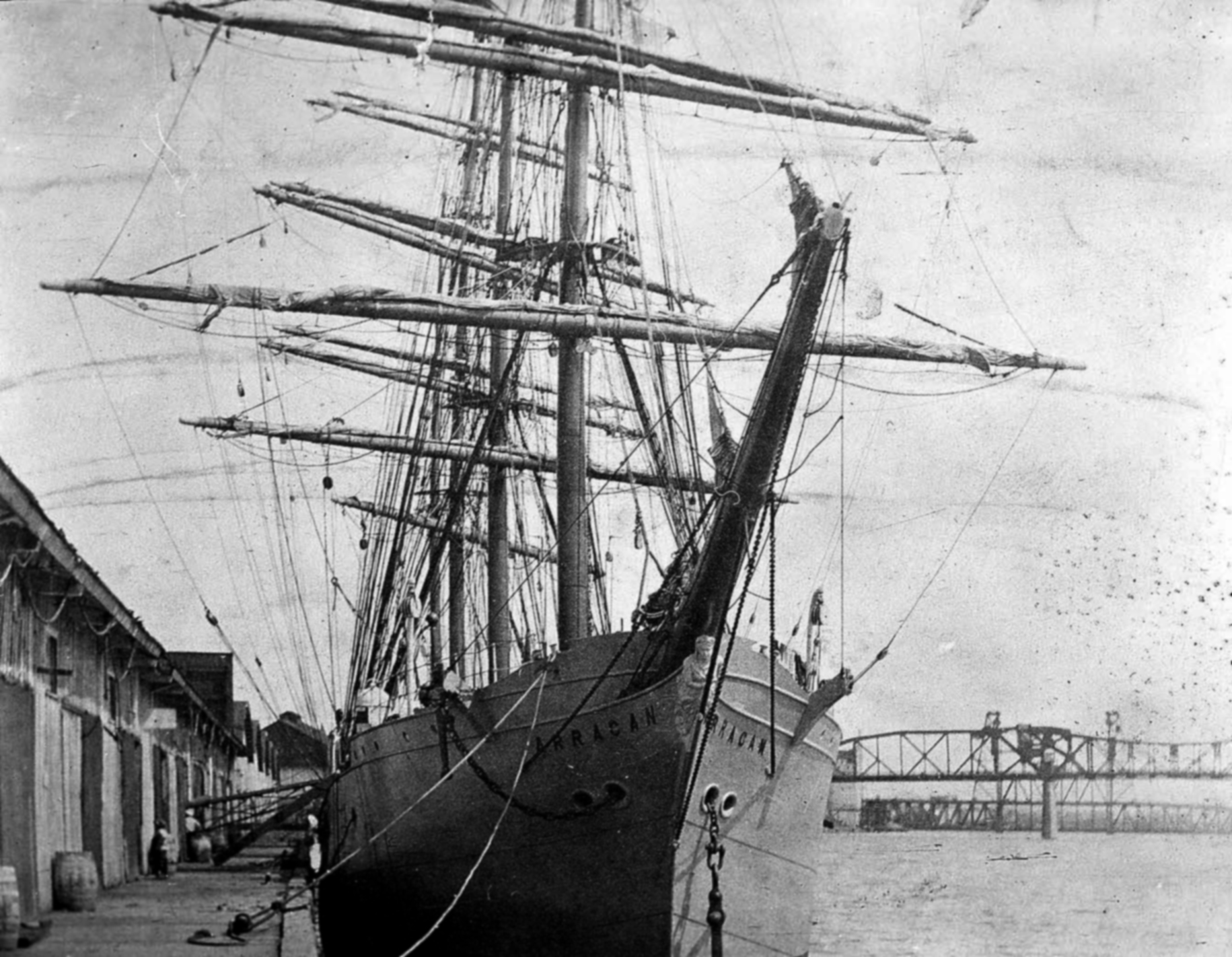 The four-masted, 2,300-ton barque Arracan, one of the last of the British grain fleet, at the wharf in 1913. (Image: Salem Public Library)
