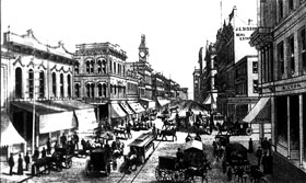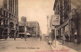 Third Street in Portland, looking northward. The tiny "X" at the vanishing point in this image was marked on this postcard by the person who mailed it in 1907, to denote his place of residence. (Image: Postcard)