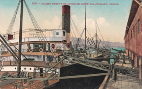 Longshoremen load sacks of wheat on a steamer at a Portland wharf using powered conveyer belts, around 1910. The switch from sails to steam eventually drove the shanghaiiers and crimps out of business. (Image: Postcard)