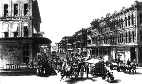 Second Avenue looking north from Yamhill Street. Pictured are the offices of The West Shore magazine and the printshop of Oregon Historical Society founding father George Himes; across the street is the office of one of Portland's short-lived alternatives to the Oregonian, the Portland Daily News. (Image: Library of Congress)