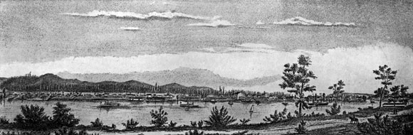 A panoramic drawing of Portland as seen from the then-undeveloped east bank of the river in 1858, one year before ex-mayor Vaughn built his controversial wharf. (Image: Joseph Gaston)
