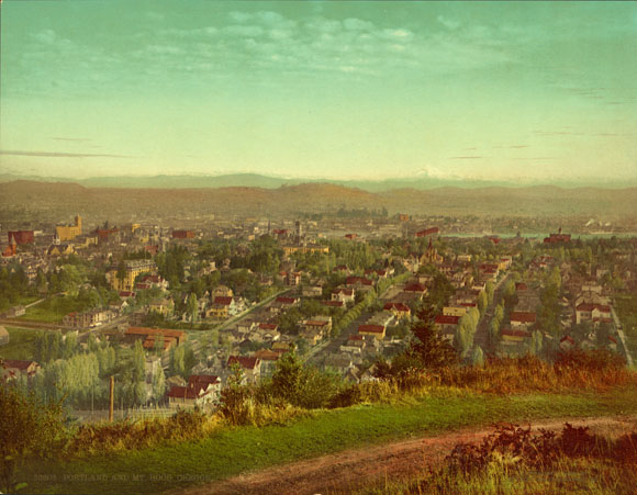 A "Photochrom" image of the view of Portland as seen from Council Crest in 1901. Photochrom was a brand name for a highly sophisticated system of colorizing black-and-white images invented and promoted by a Swiss company, which made Photochrom prints of thousands of places around the world to market to tourists and collectors. (Image: Library of Congress)