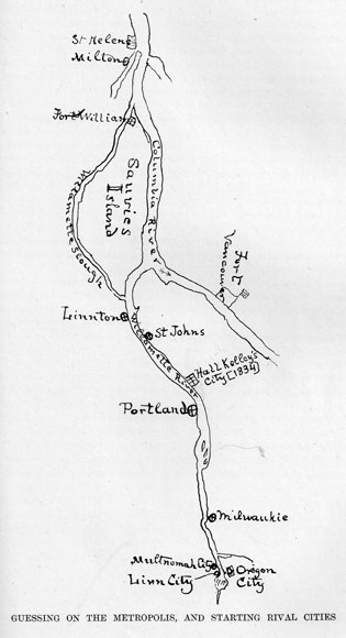A hand-drawn map from the 1860s showing the locations of the various nascent cities vying for regional dominance in the area of what is now the Portland Metropolitan Area. "Hall Kelley's City" would later become East Portland. (Image: Joseph Gaston)