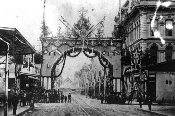 A crowd of well-wishers gathers at First and Stark to celebrate the completion of the Northern Pacific Railway in 1883; the line connected Portland, Oregon with Portland, Maine, with plenty of stops in between. When this photo was taken, Nancy Boggs would have just moved off her storied riverboat and set up shop in a land-based brothel two blocks to the right of where the photographer stood to make this picture. (Image: Salem Public Library)